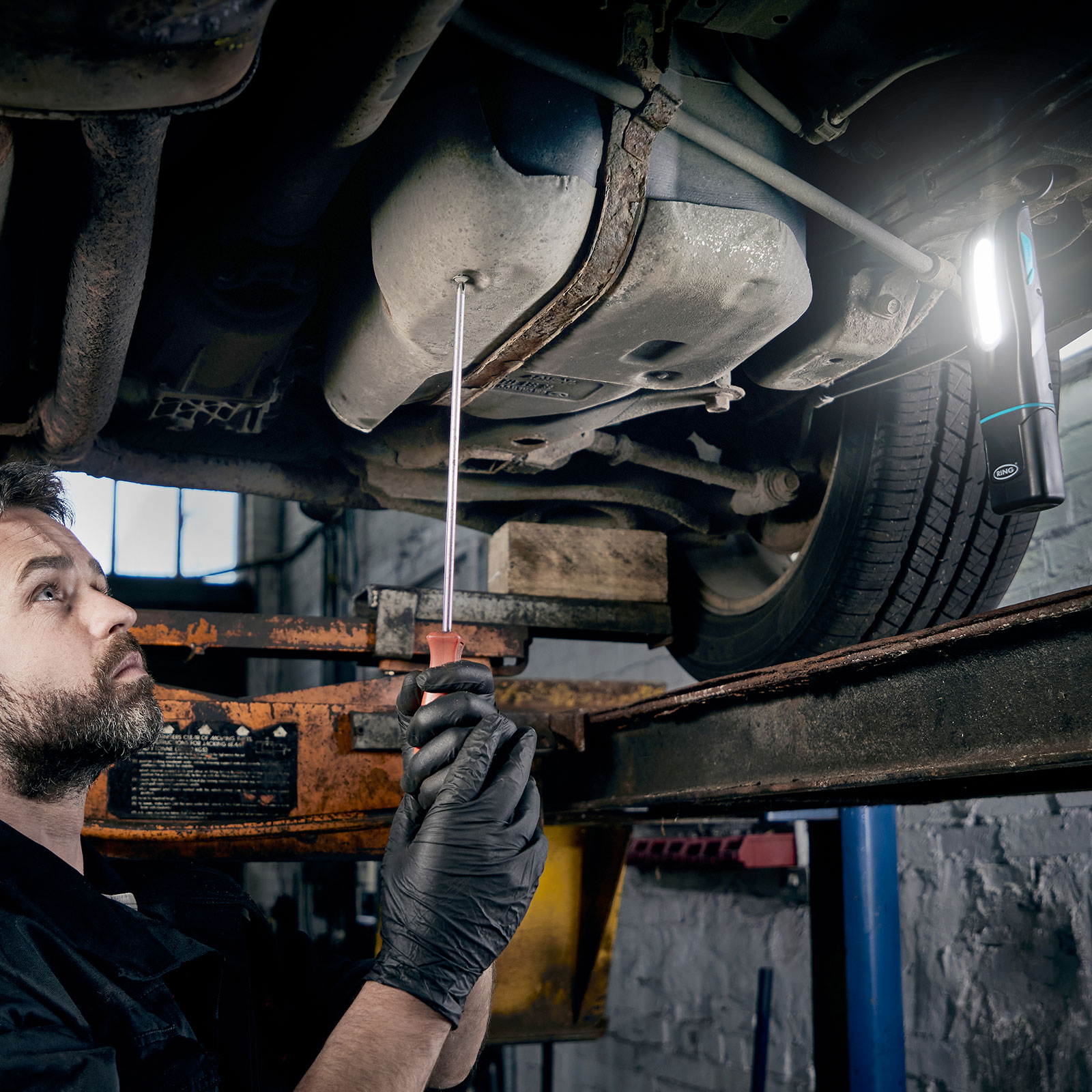 Die ideale Arbeitslampe im robusten Gehäuse mit bis 250 Lumen Leistung, die auch der rauen Arbeitsumgebung stand hält.